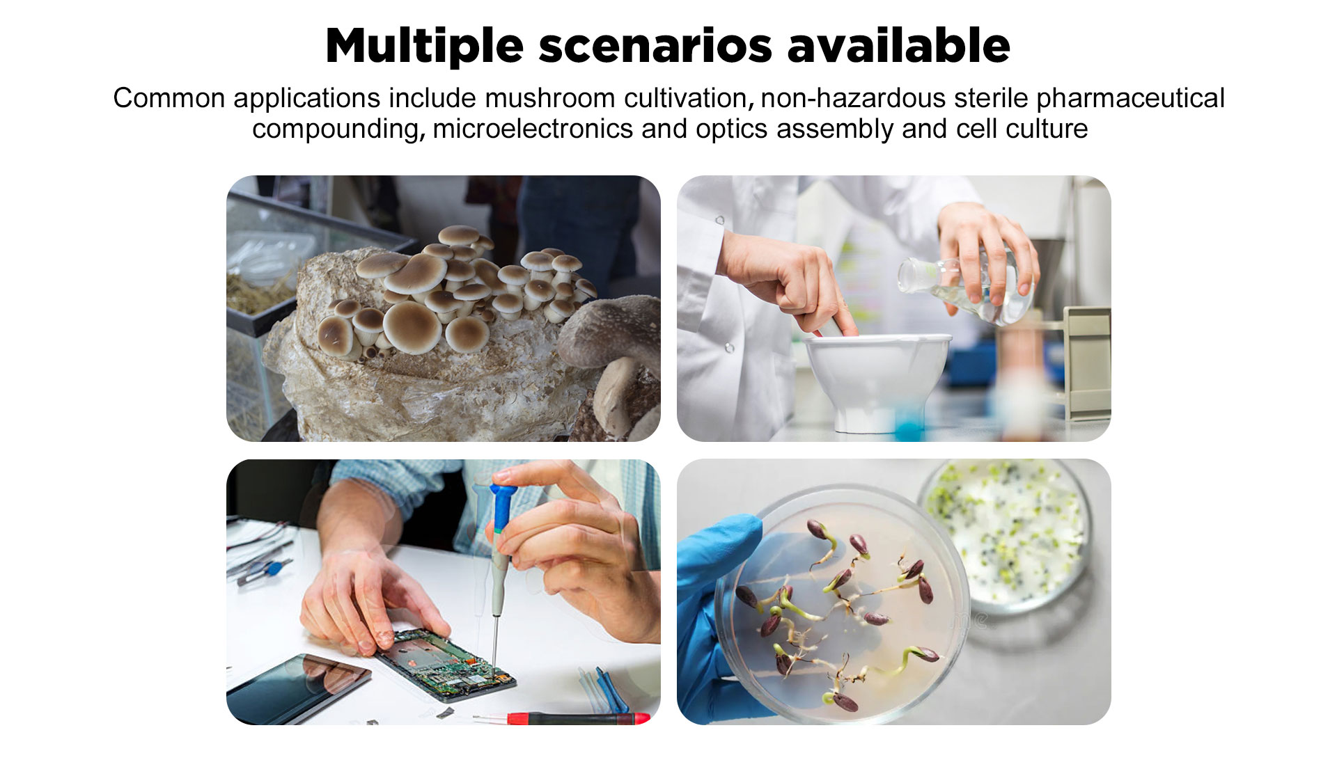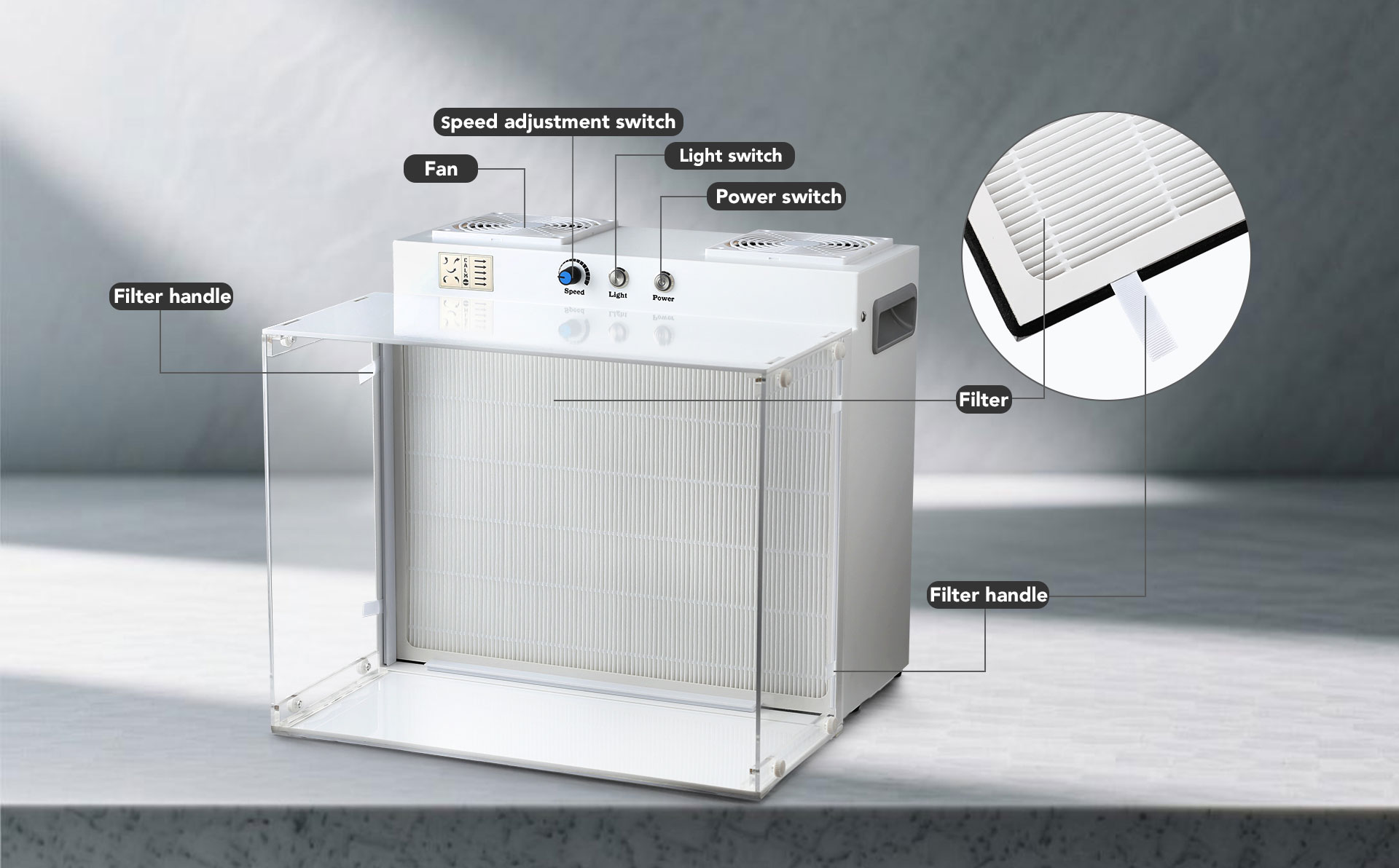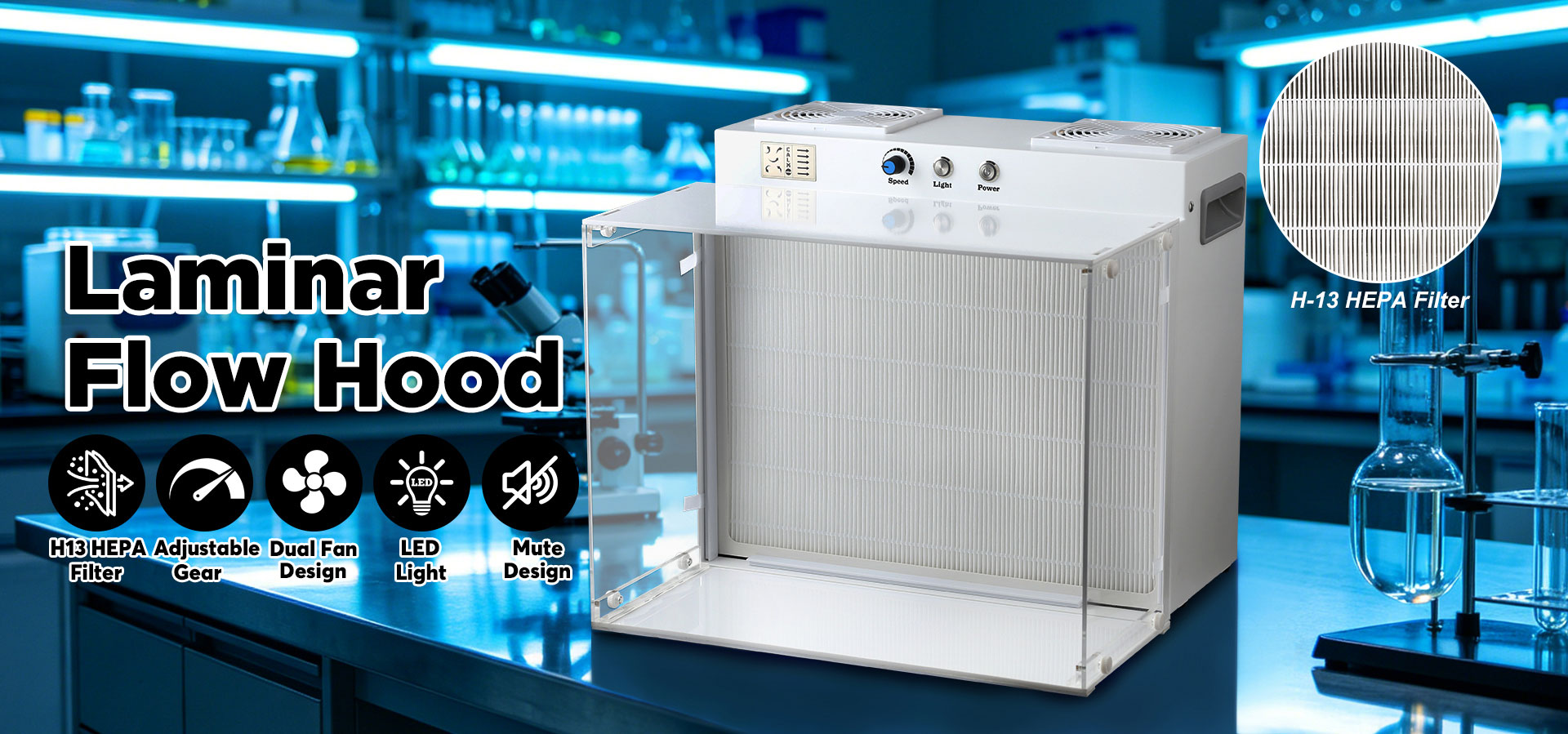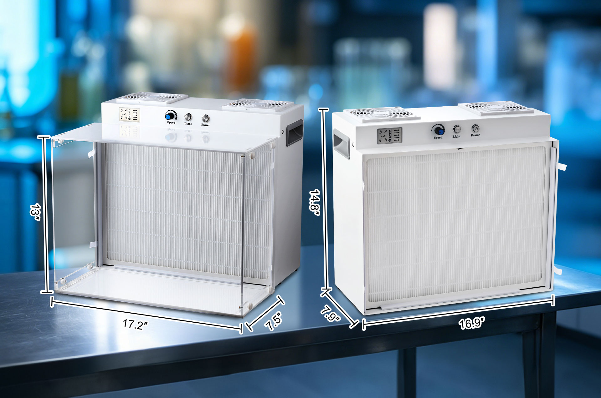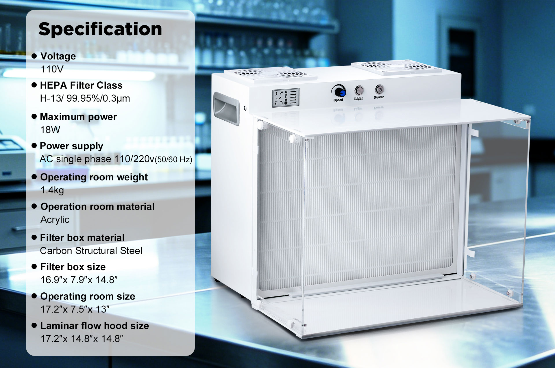 Laminar flow hood size: 17.2″x 14.8″x 14.8″